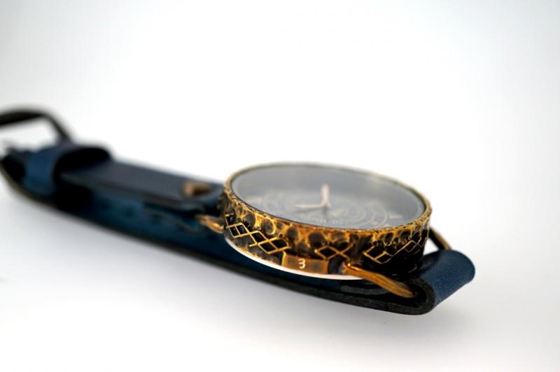 ひび割れた鮮やかな文字盤。ベルトカラーに合わせて制作。