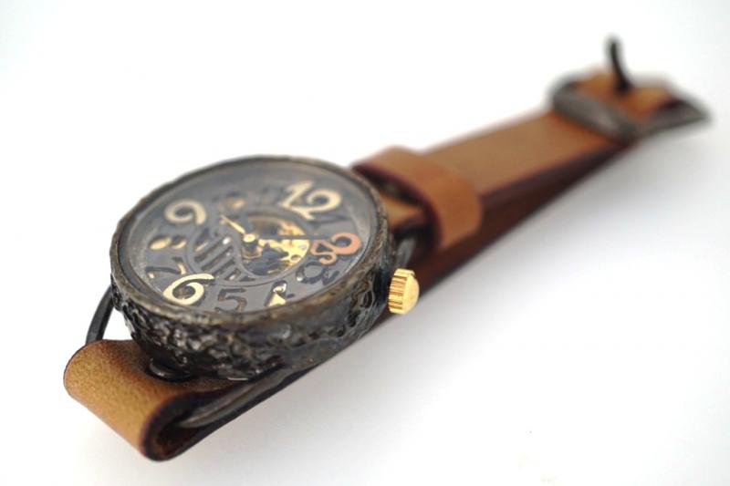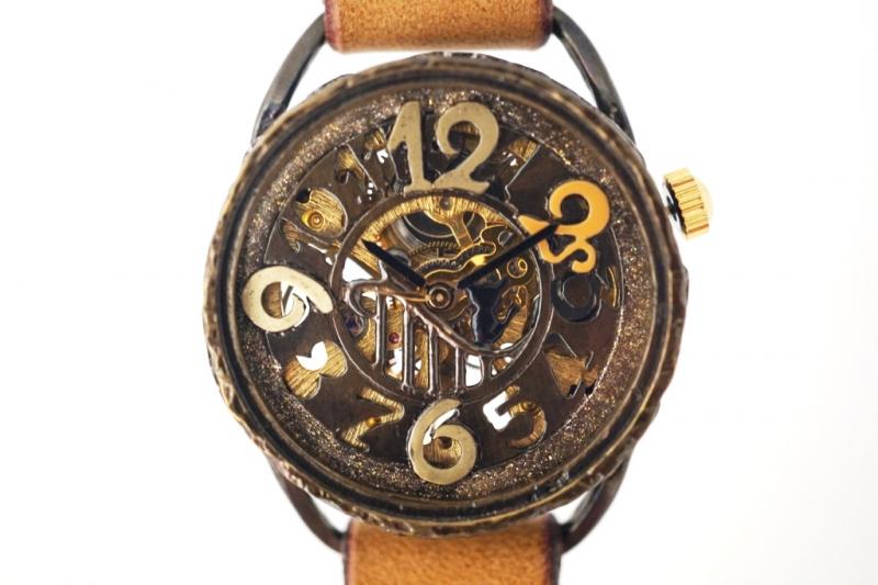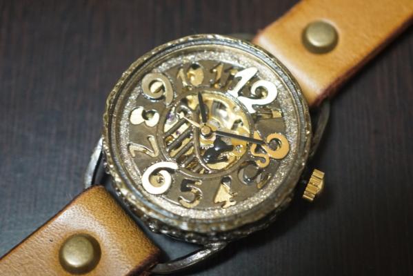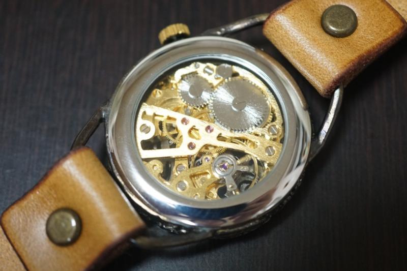 掘り抜いた数字の下には、機械式ムーブメントが見える。