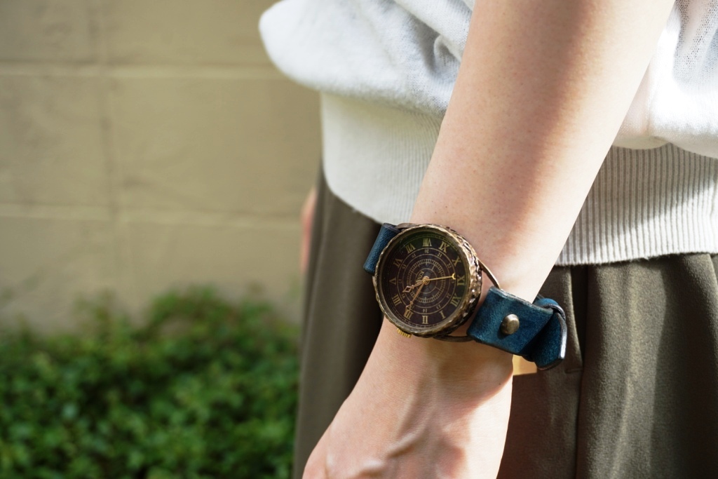 L-4 クラック ワールド ローマ 真鍮 Lサイズ ワインブラウン 手作り腕時計