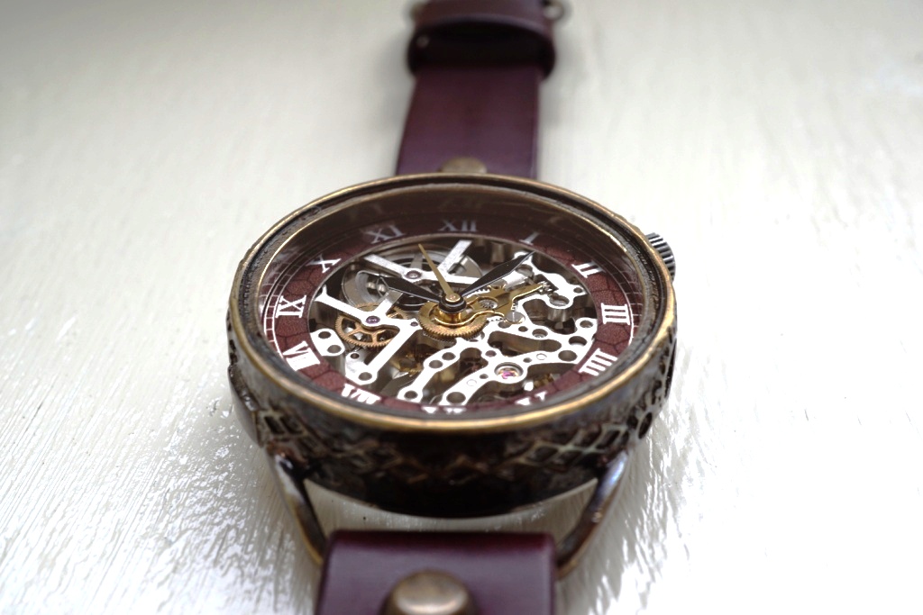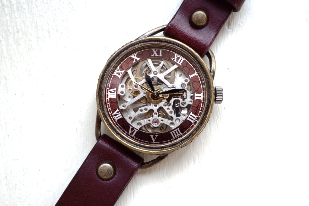メカニックシルバー AT ワインブラウン 真鍮 手作り腕時計