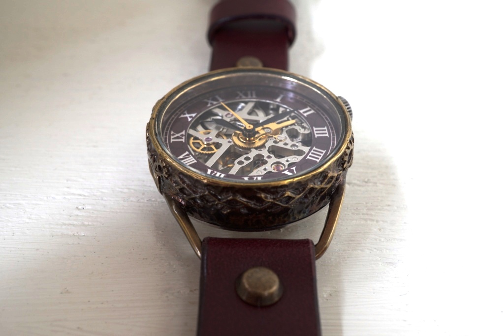 メカニックシルバー AT Mサイズ ワインブラウン 真鍮  手作り腕時計