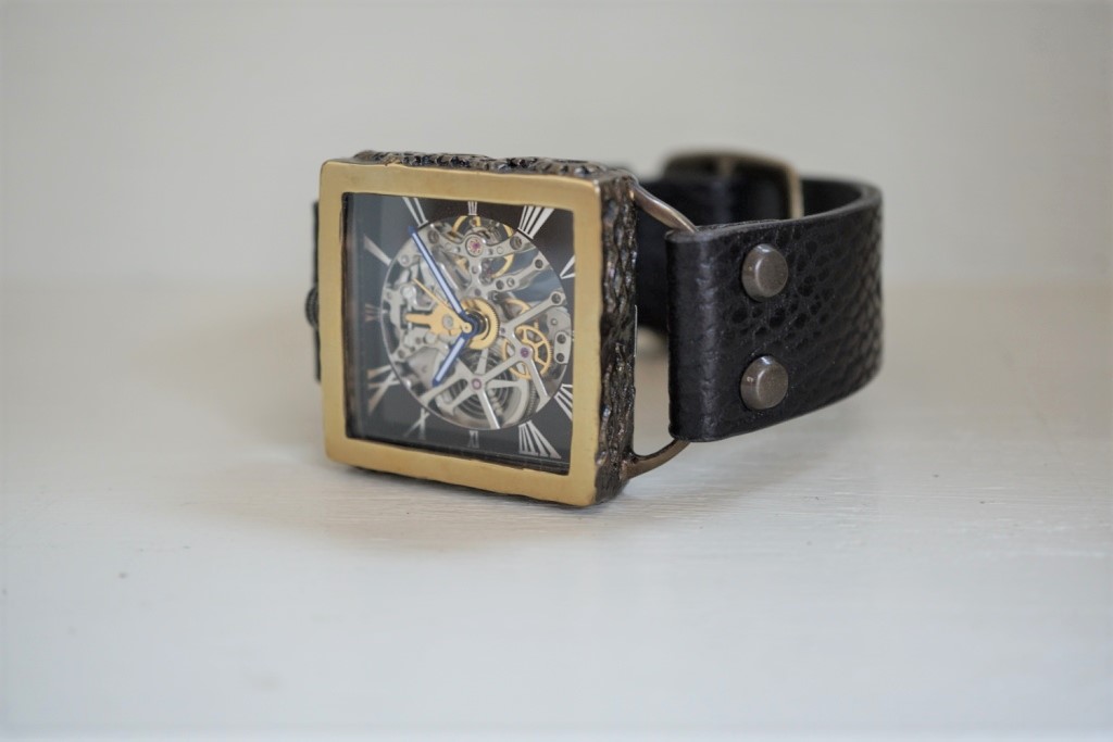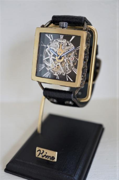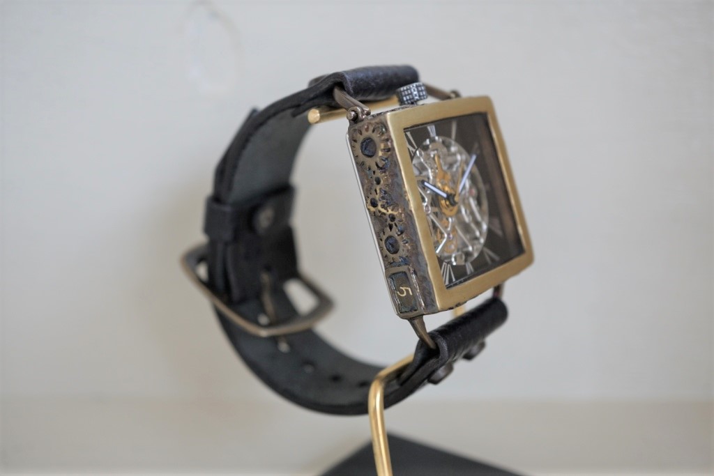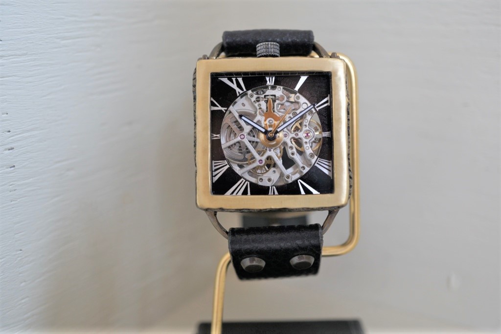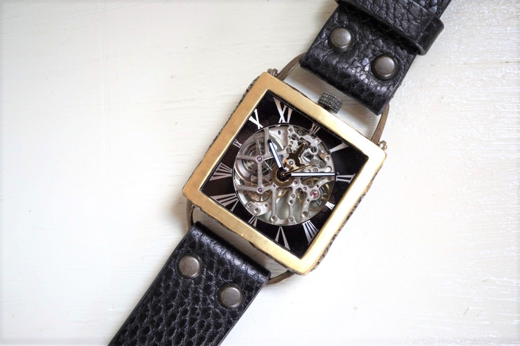 メカニックシルバースクエア 真鍮 ブラック 手作り腕時計
