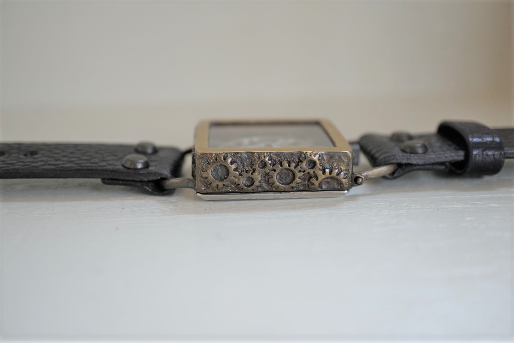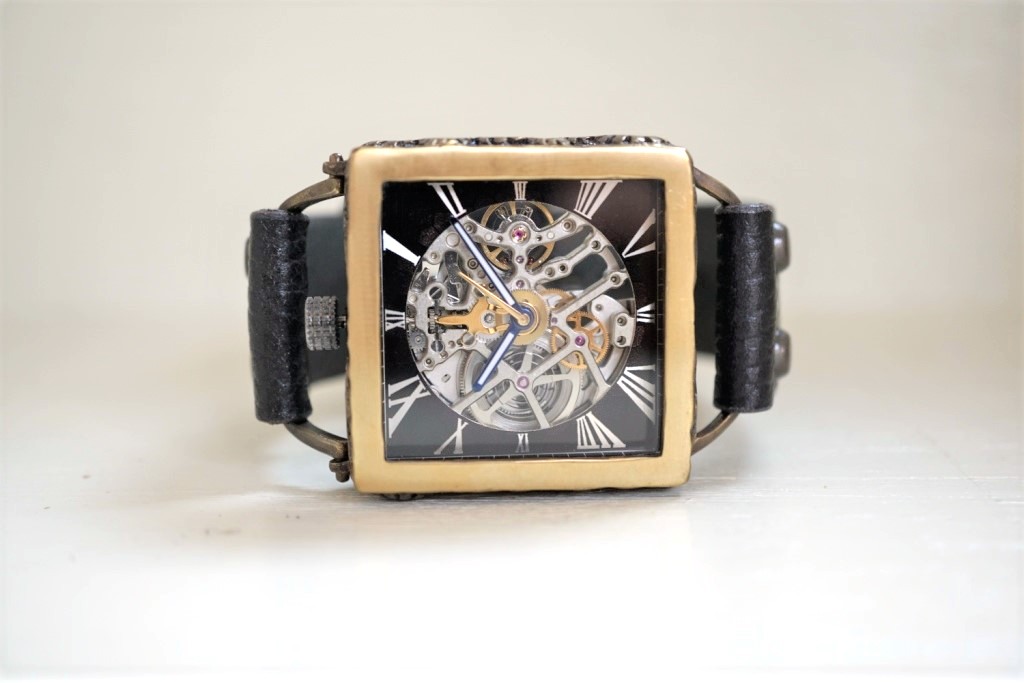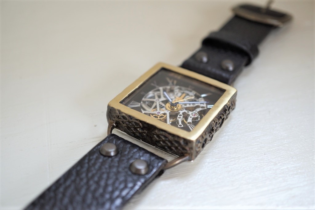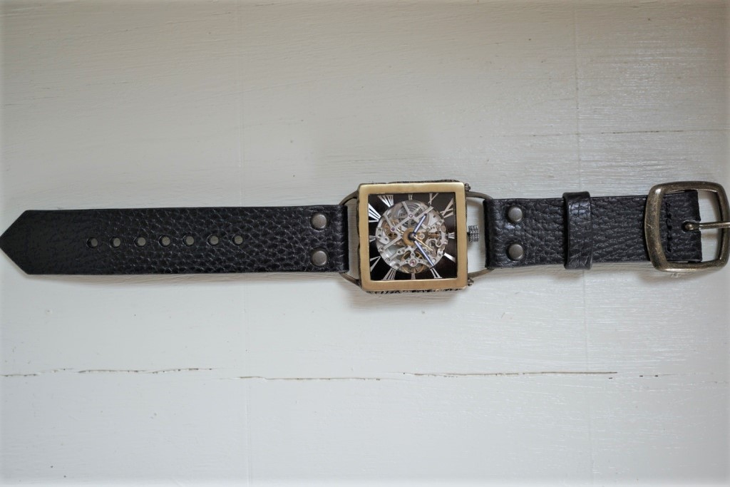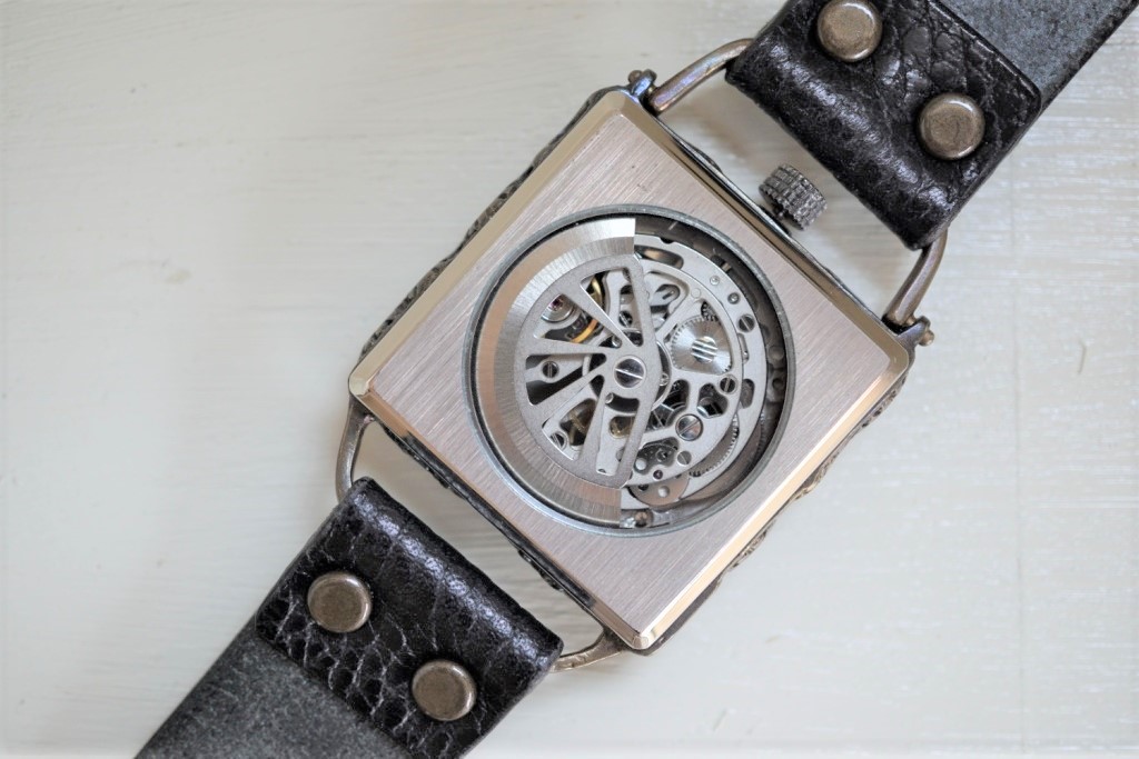 メカニックシルバースクエア 真鍮 ブラック 手作り腕時計